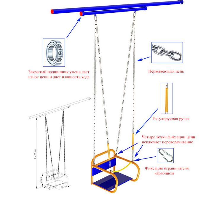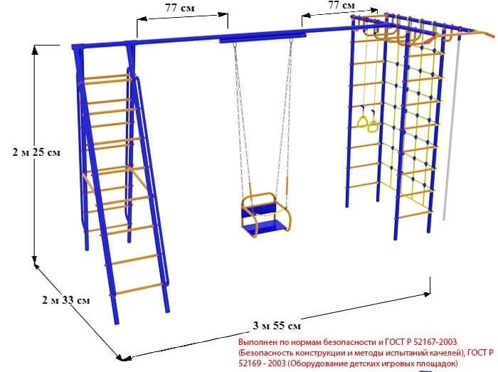 Детский спортивный комплекс "Веселый Непоседа" - Модель №9 с качелями на подшипниках/цепях предназначен для выполнения различных спортивных упражнений способствующих более полному физическому развитию детей в возрасте от 3,5 лет