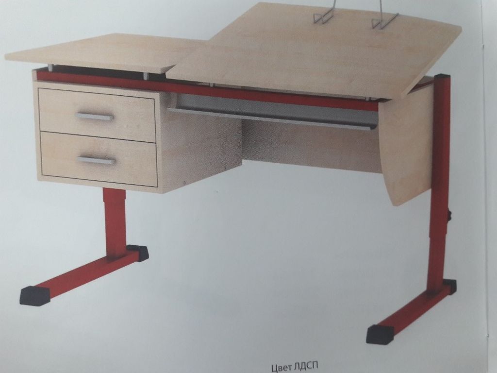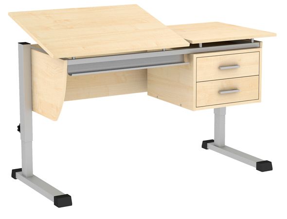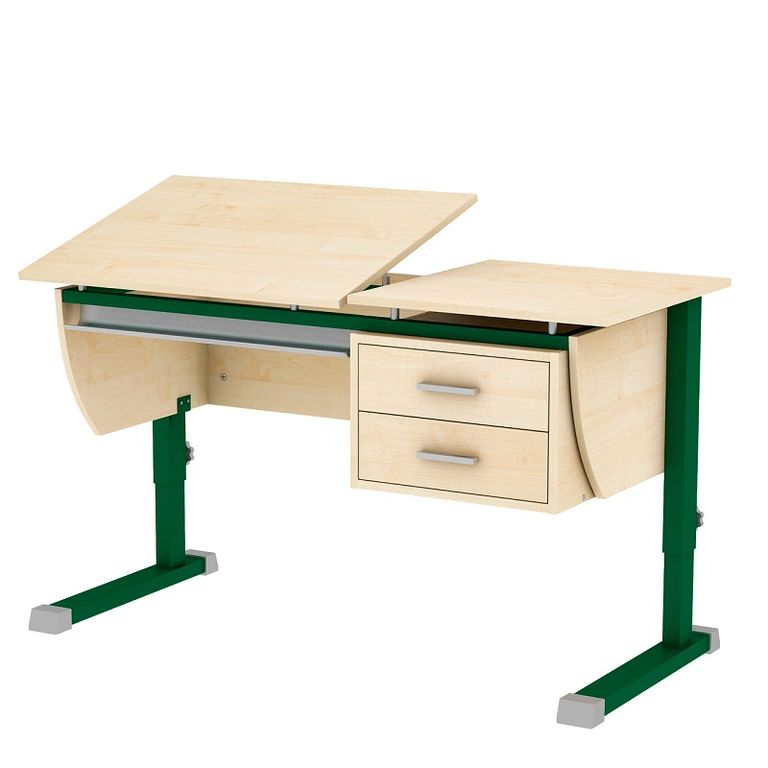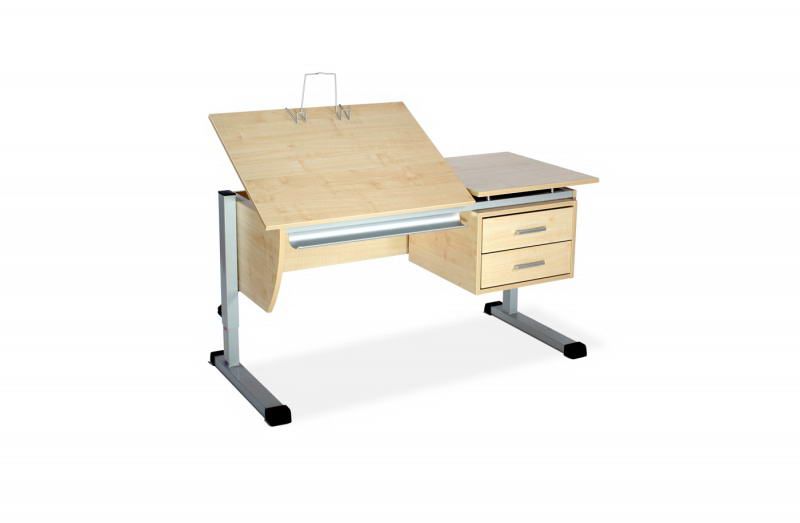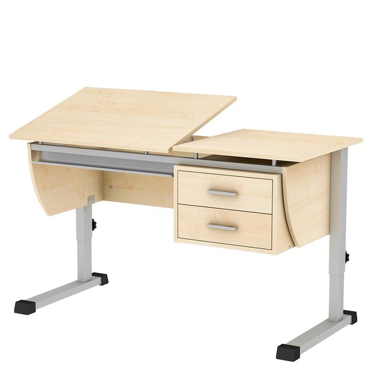 Часть столешницы (ШхГ, мм: 700х535) регулируется в 13 положениях под углом от 0 до 55 градусов, другая часть (ШхГ, мм: 490х535) закреплена горизонтально, торцы отделаны противоударной кромкой ABS толщиной 2мм, опорные концы труб каркаса закрыты пластиковыми протекторами. Парта оснащена лотком для письменных принадлежностей.