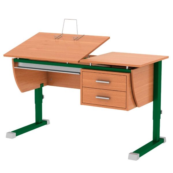 Тумба и лоток для письменных принадлежностей по желанию устанавливается слева или справа. Сидеть за этим столом будет комфортно не только правше, но и левше: подвесная тумба с 2мя ящиками и горизонтальная часть столешницы по желанию устанавливаются справа и слева. Книгодержатель в комплект поставки не входит.