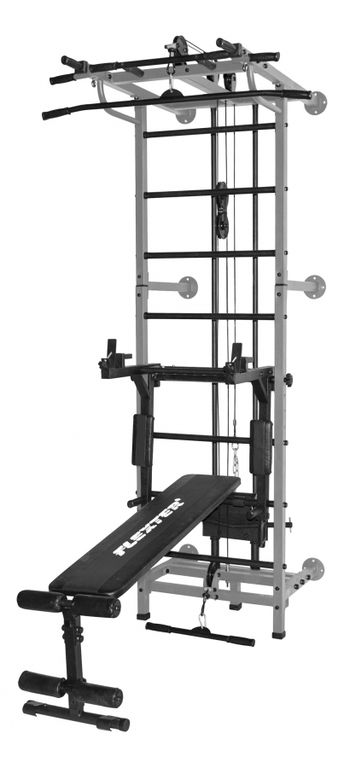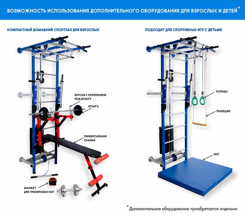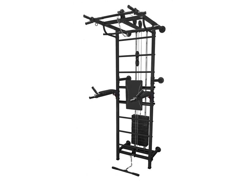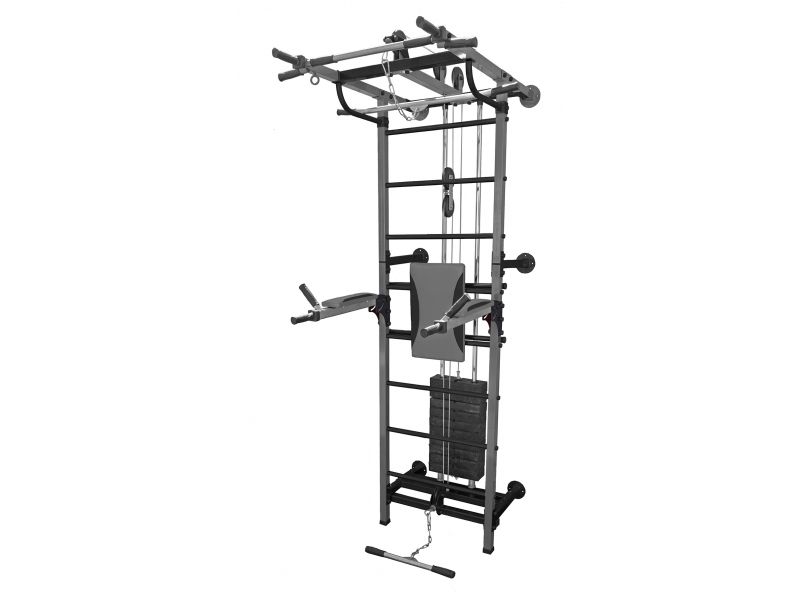 В комплект спортивного комплекса входит: лестница, турник, брусья -штангодержатель со спинкой, система: верхняя и нижняя тяга.
