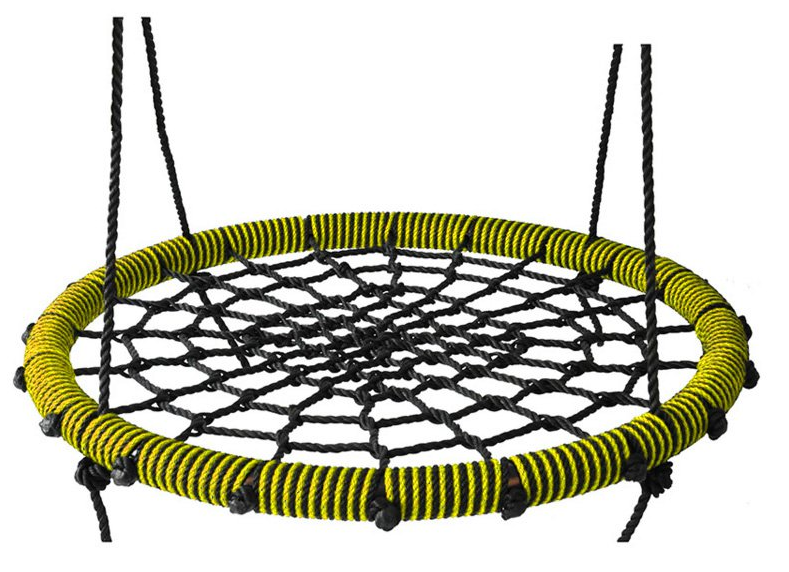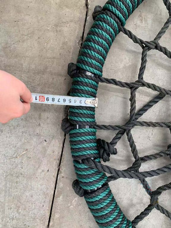 Рама качелей произведена из стальной трубы, диаметром 45 мм, и толщиной стенки 1,5 мм, полимерное покрытие, оплетка рамы выполнена из высококачественного полиамидного каната, устойчивого к ультрафиолетовому воздействию, диаметром 8 мм, Диаметр кольца в обмотке- 65 мм