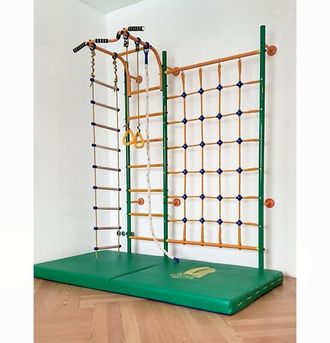 Детский спортивный комплекс "Пристенный "ПЛЮС" с сеткой для лазания" предназначен для выполнения различных общеразвивающих и укрепляющих упражнений, способствующих более полному физическому развитию детей и подростков