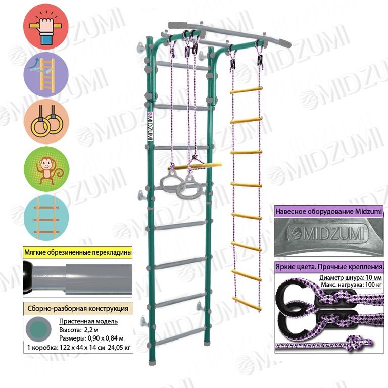 Домашний спортивный комплекс Midzumi Banji Kabe подарит ребенку возможность полюбить спорт, расти здоровыми и уверенными в себе личностями. А характеристики данного комплекса позволяют заниматься и взрослым. Организуйте спортивный уголок с помощью универсальной и малогабаритной шведской стенки, которая оснащена веревочной лестницей, тарзанкой и гимнастическими кольцами.