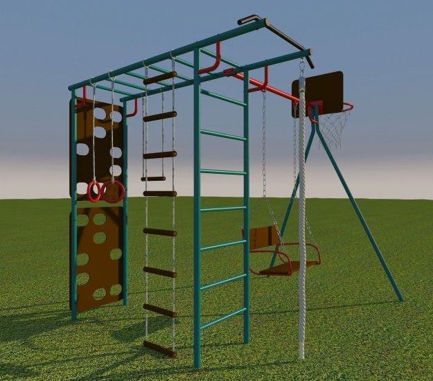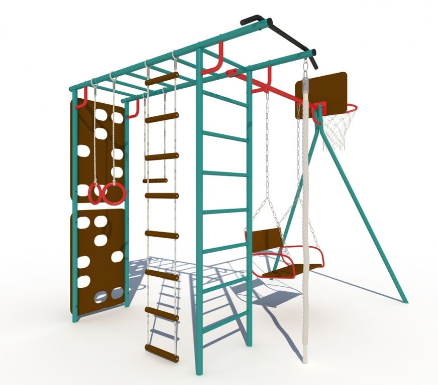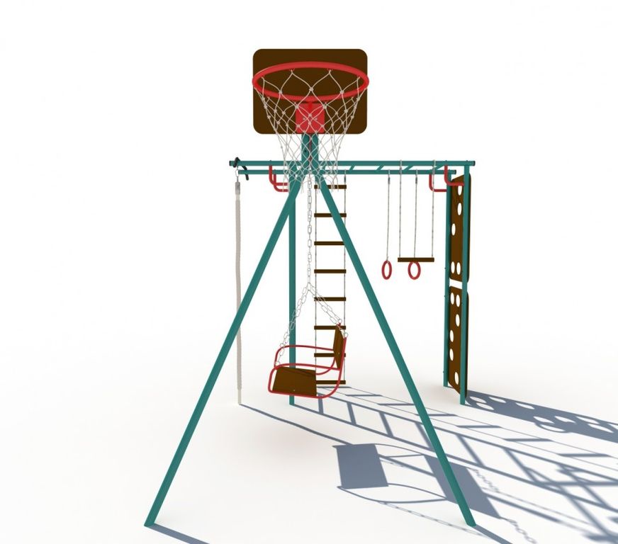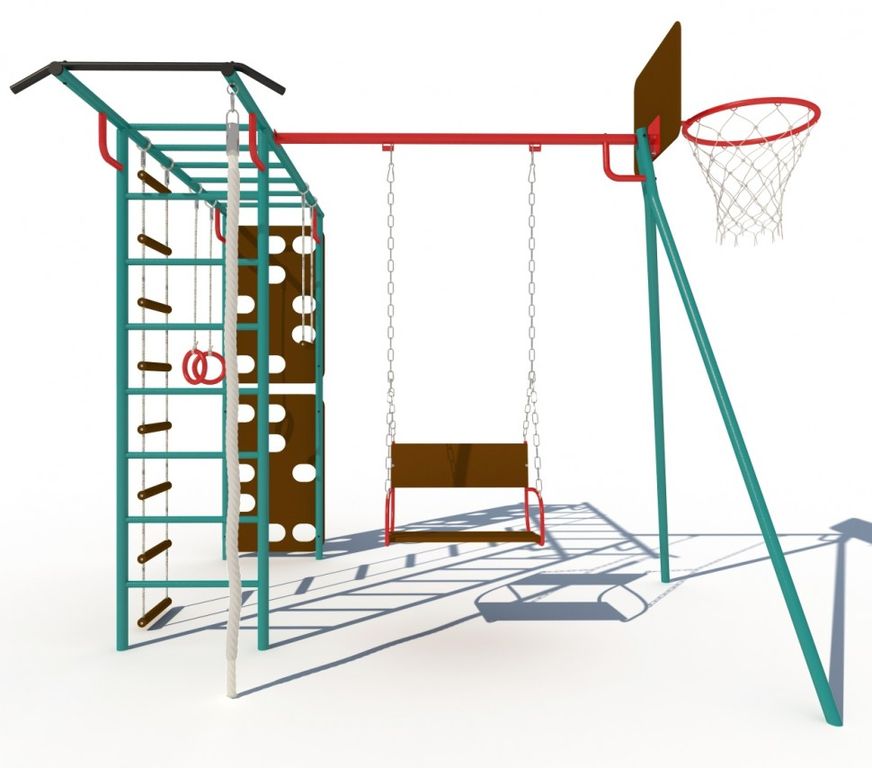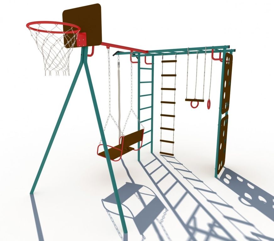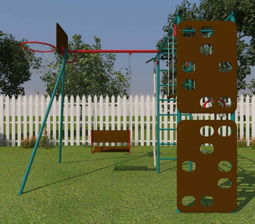 Скалодром, сиденье качелей и баскетбольный щит изготовлены из специальной влагостойкой фанеры, предназначенной для уличной эксплуатации.