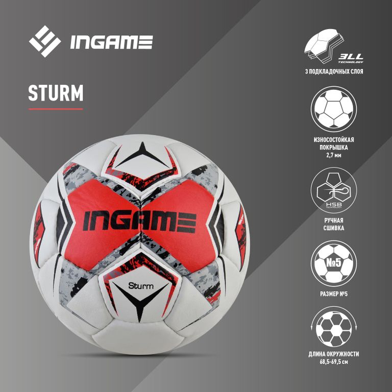 Мяч футбольный Ingame Sturm с ярким дизайнерским принтом находится в любительской линейке Ingame Basik, предназначен для игры в футбол на следующих поверхностях: натуральный газон, синтетическая трава, резина, паркет.