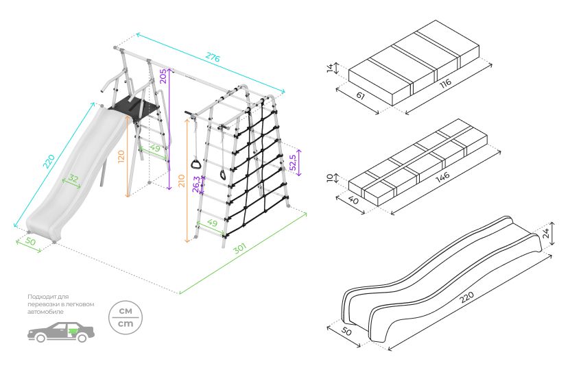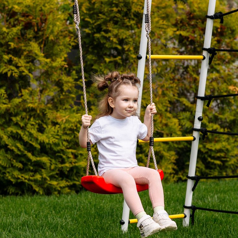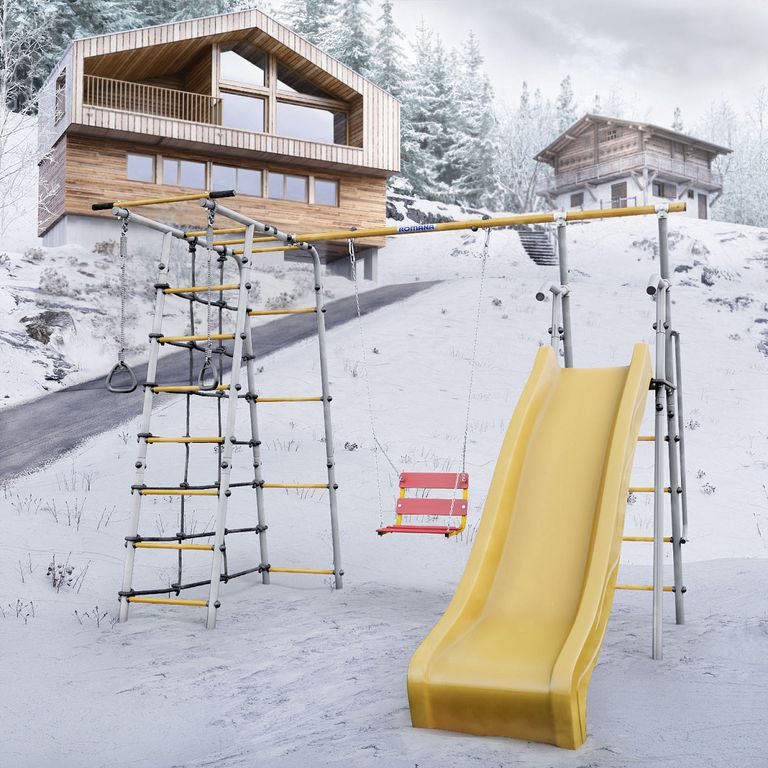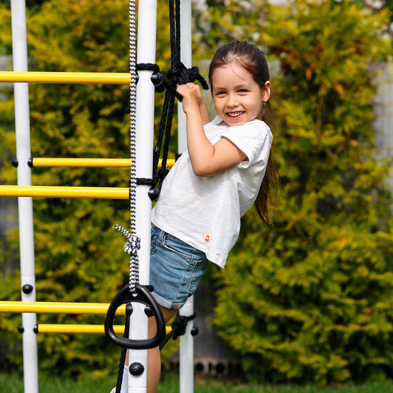 Все навесное оборудование выполнено из атмосферостойких материалов — в летнее время их можно не убирать в дом после занятий.