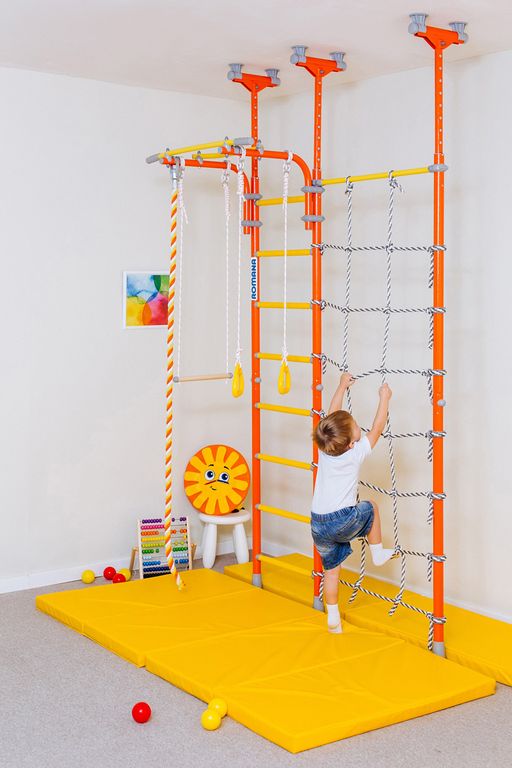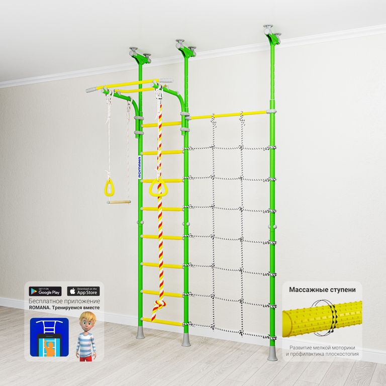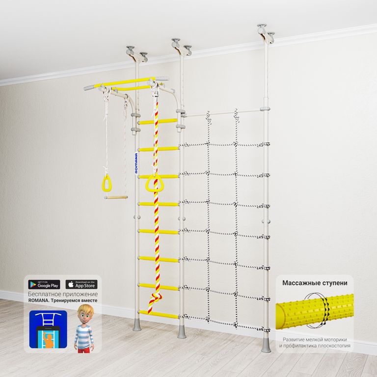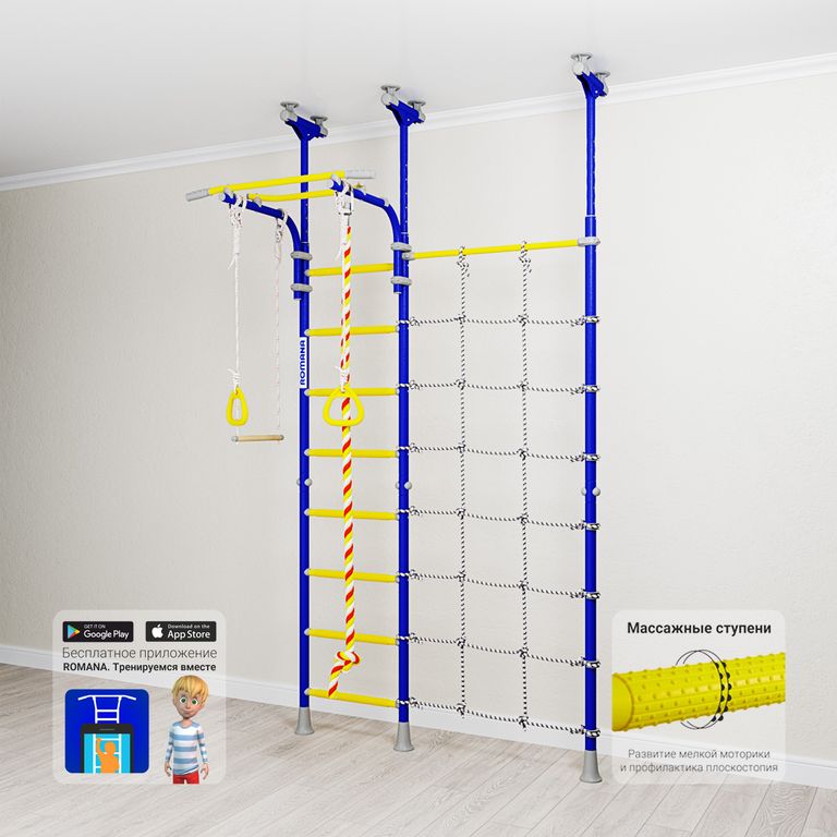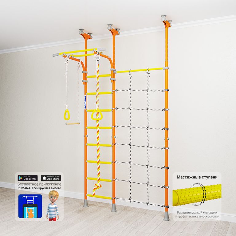 Детский спортивный комплекс ROMANA R3 устанавливается враспор, поэтому для его установки не нужно сверлить стены. У этого комплекса есть преимущество перед рядом распорных моделей - предусмотрен перемещаемый турник, который можно крепить на любой высоте с помощью специальных удобных хомутов.