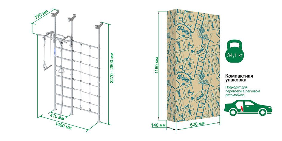 В комплекте ROMANA R3 есть широкий канатный лаз из шнура повышенной прочности. Лаз можно разместить на любой стороне лестницы. Ширина составляет комплекса вместе с лазом составляет 1.5 м. Конструкция стенки выдерживает вес в 100 кг (испытания проводятся при 200 кг). Из дополнительного навесного оборудования в комплекте есть канат и кольца.