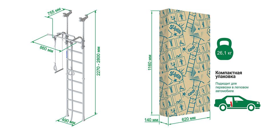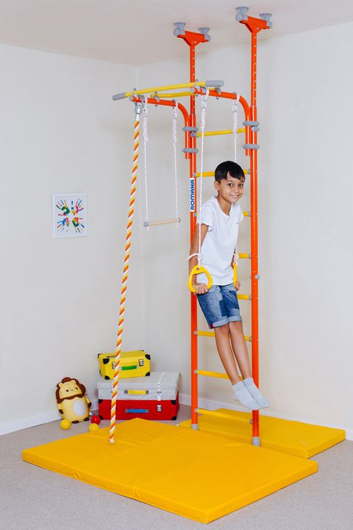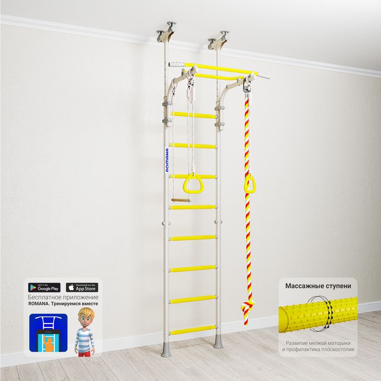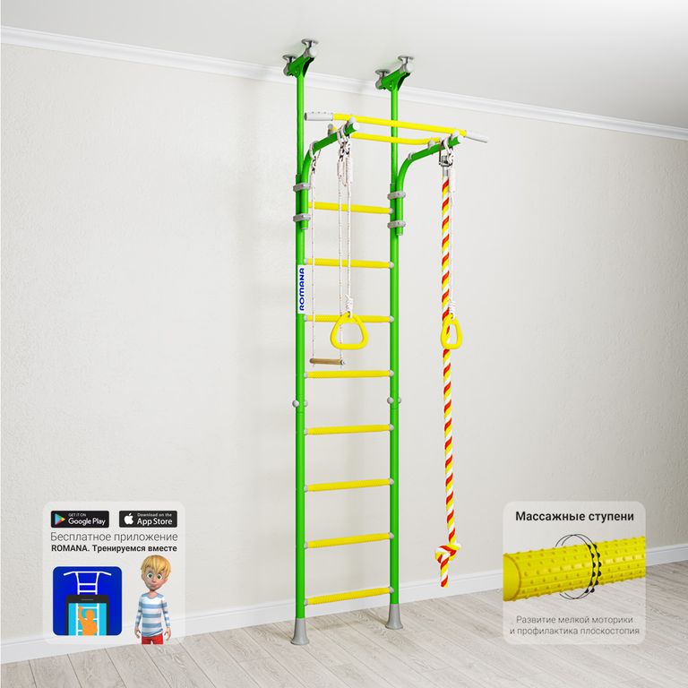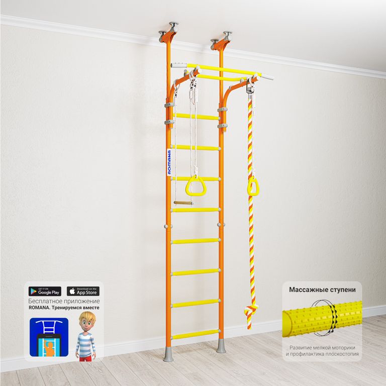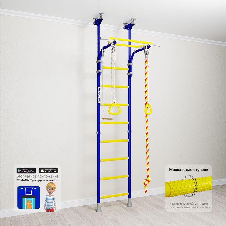 Детский спортивный комплекс ROMANA R5 Kometa - современная шведская стенка с возможностью установки враспор к полу и потолку. Не нужно сверлить стену и крепить к ней раму. Металлокаркас стенки рассчитан на вес в 100 кг (испытан нагрузкой в 200 кг).