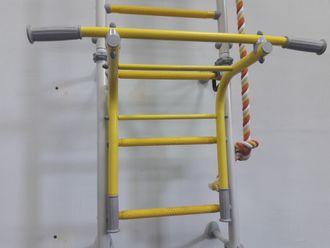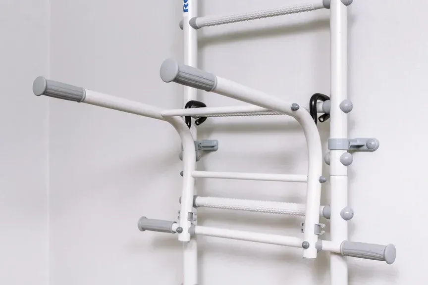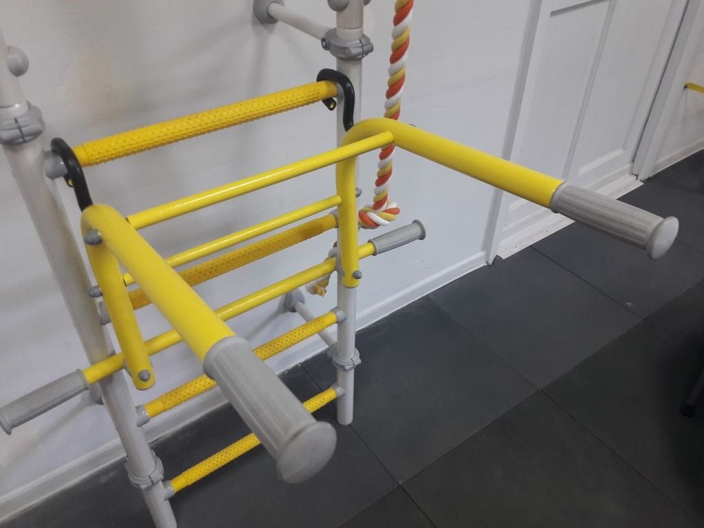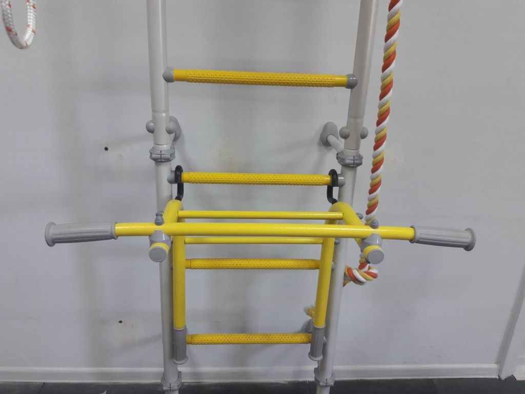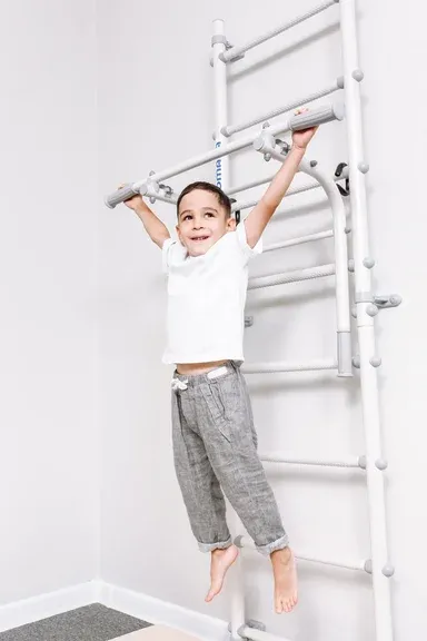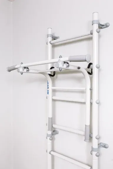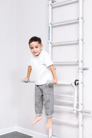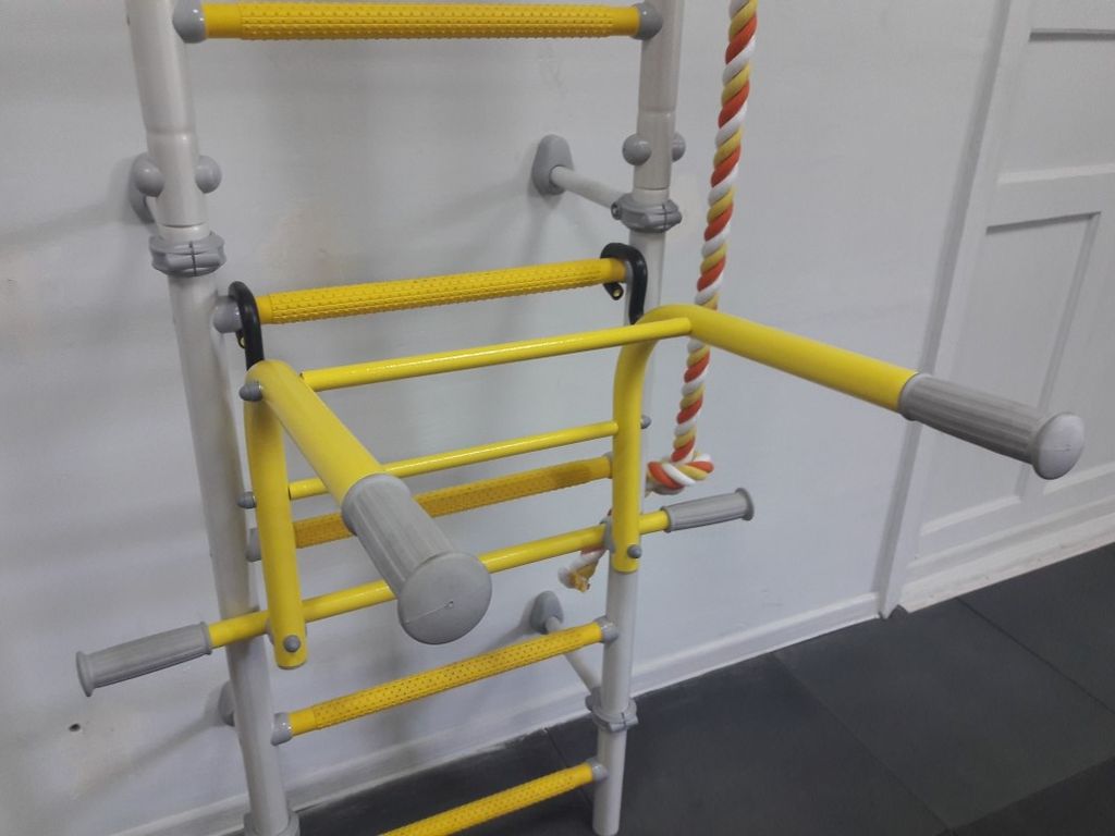 Отличное дополнение к шведской стенке. Турник работает как ограничитель высоты для детей младшего возраста.